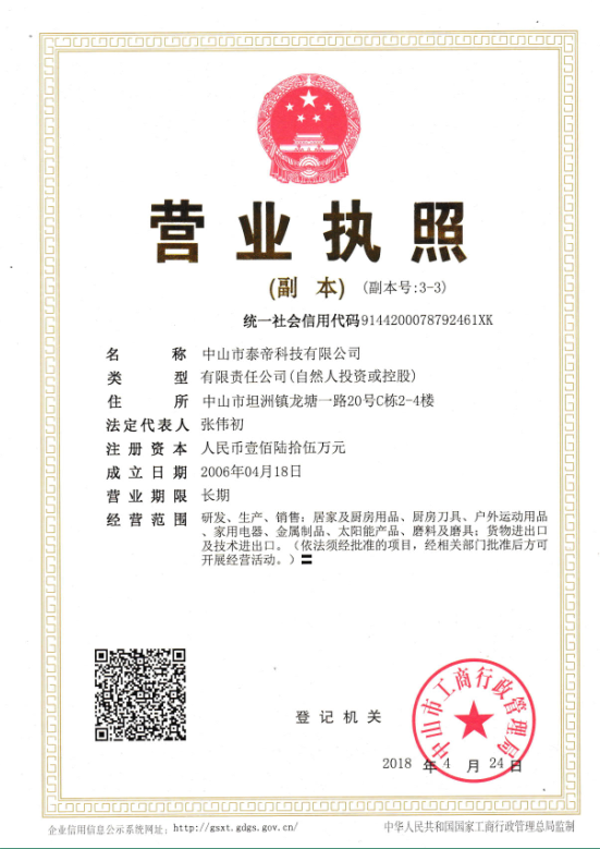 - 經營范圍:研發、生產、銷售;居家及廚房用品、廚房刀具、戶外運動用品、家用電器、金屬制品、太陽能產品、磨料及模具;貨物進出口及技術進出口。(依法須經批準的項目,經相關部門批準后方可開展經營活動。)